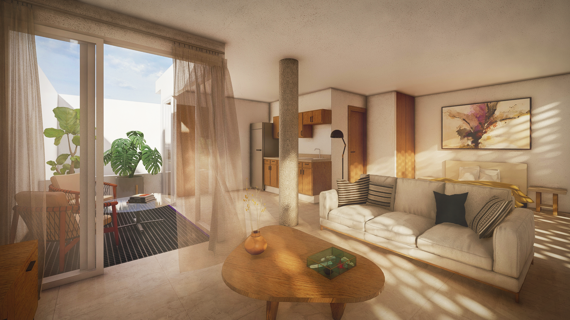El término monoambiente se ha utilizado en recientes fechas para describir a los espacios que pueden tener diversos usos y de la misma manera, no cuentan con muros para dar una mayor amplitud a sus habitantes; en esta vivienda se retoma este concepto para brindar una solución espacial cálida y abierta, conectándose con el exterior a través de una celosía.